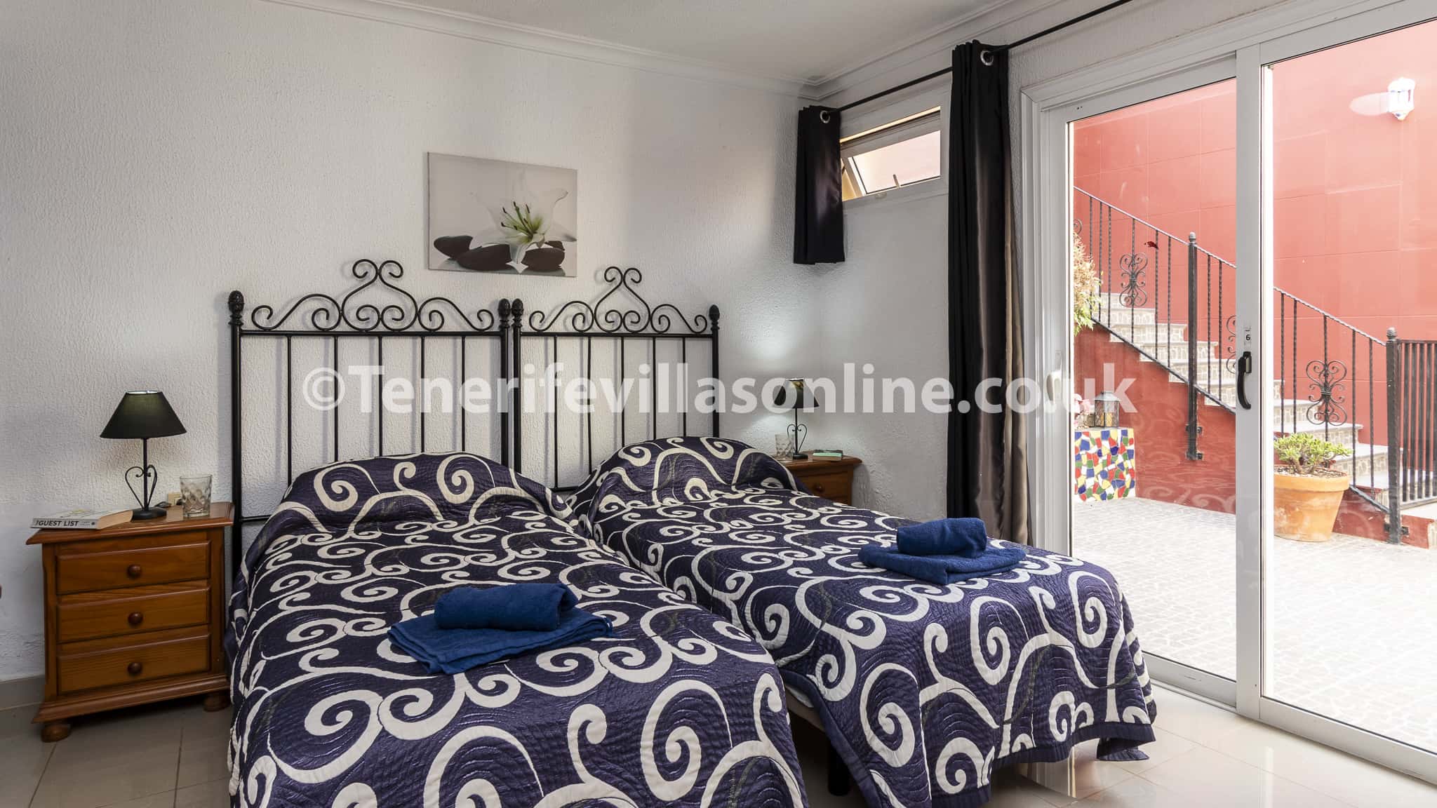Bedroom 5: single beds (x2), fitted wardrobes, ceiling fan, en suite, patio doors to pool terrace