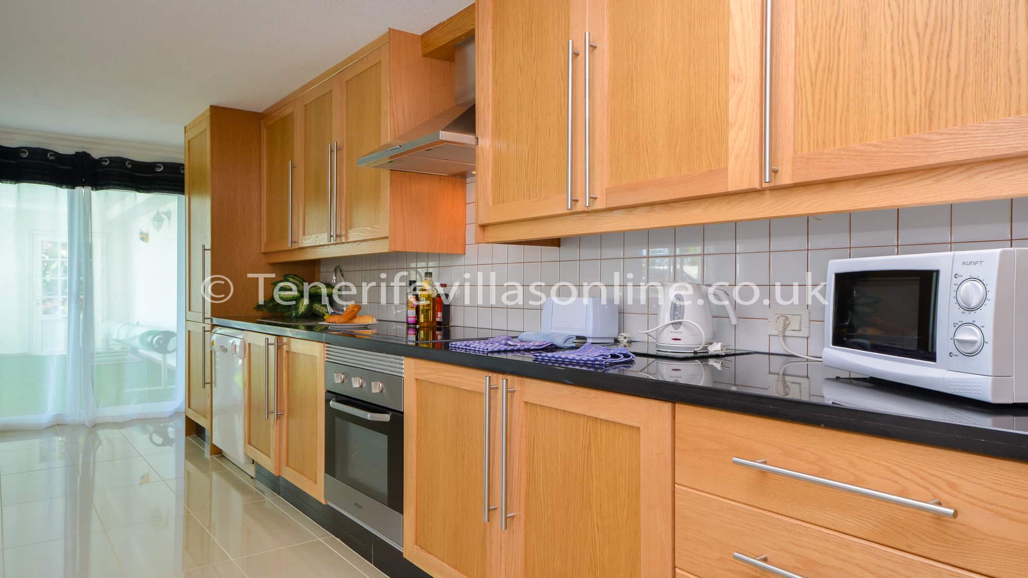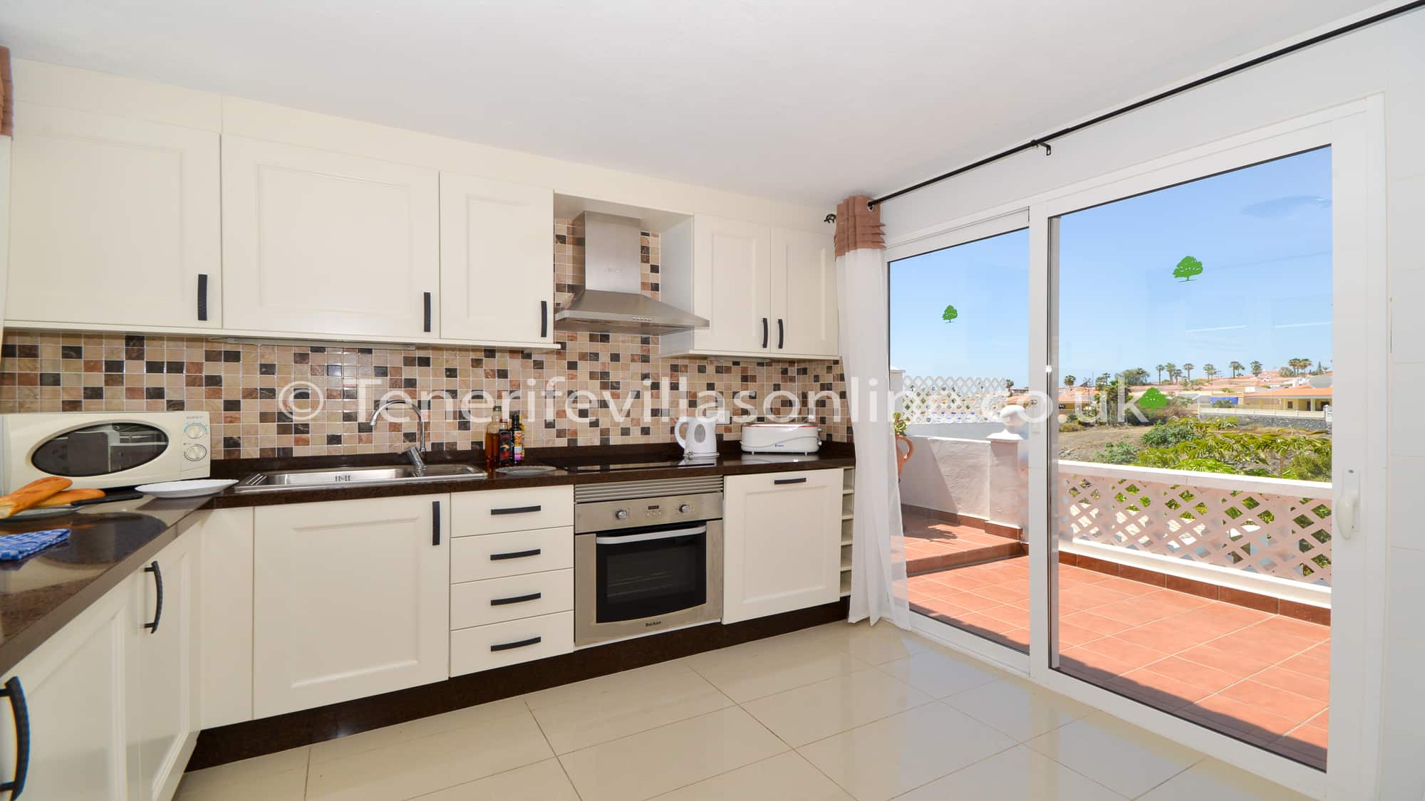 Kitchen: oven/hob, fridge/freezer, dishwasher, coffee maker, kettle, microwave, toaster, sandwich maker, granite work surfaces, patio doors to terrace