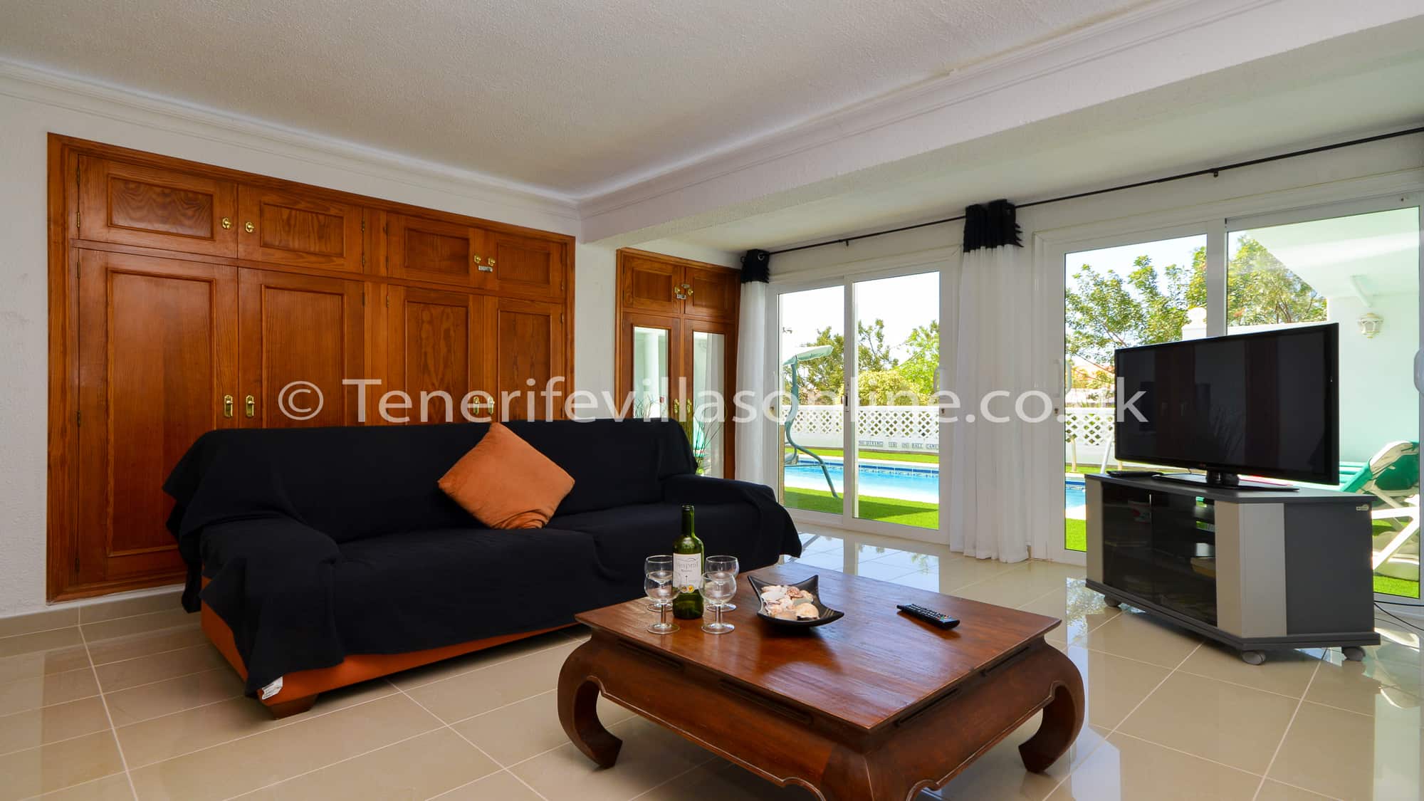 Lounge: 3 seater sofas (x2), 32 inch flat screen TV, DVD player, CD player, offers all UK channels including Sky movies, Sports, children TV, 6 live premiership football channels, over 2000 films, box sets & catch up, ceiling fan, patio doors to pool terrace