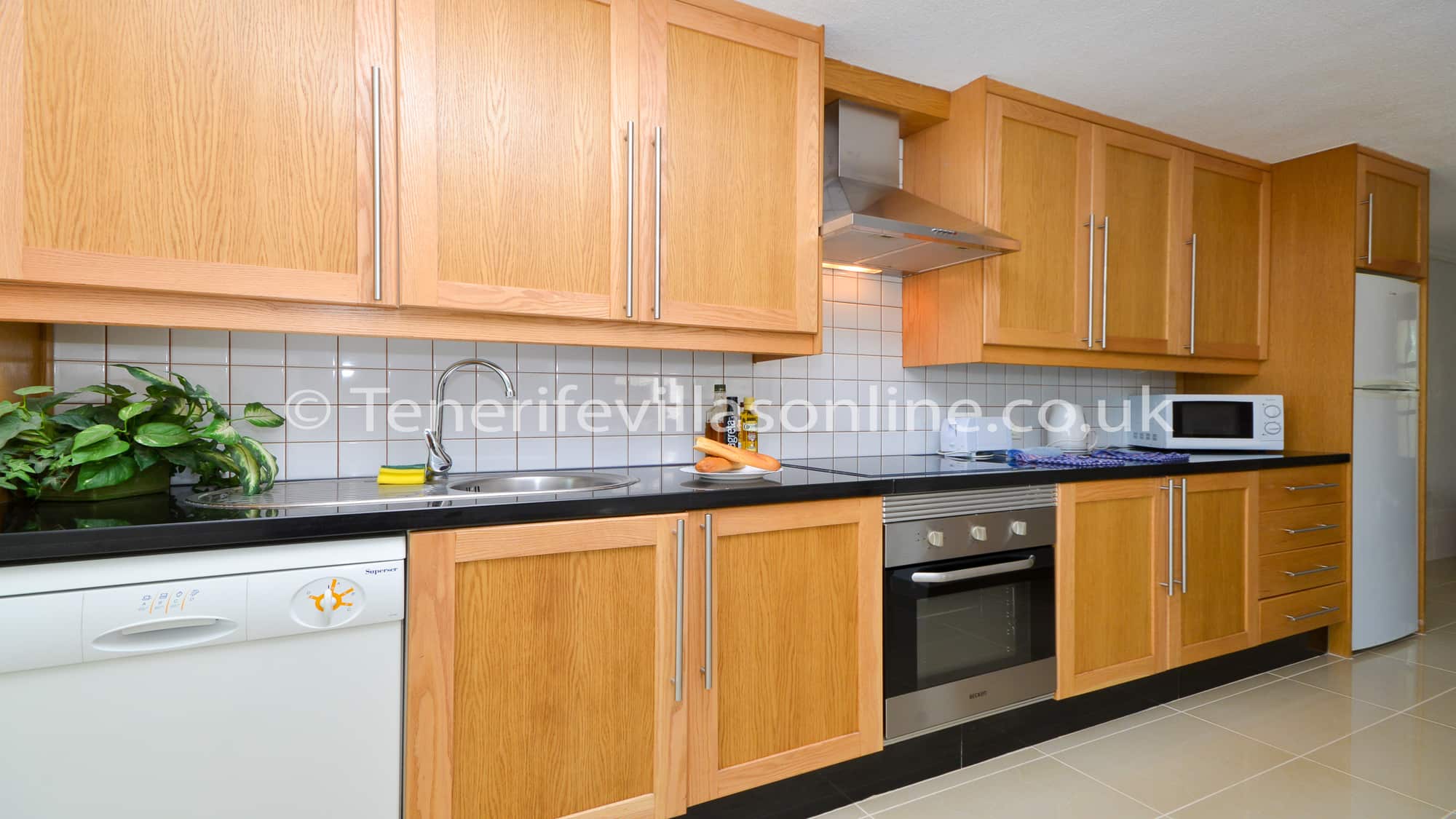 The main villa is all on one level. The comfortable lounge has a 3 seater and 2 seater leather sofas. The 32 inch LCD and offers all UK channels including Sky movies, Sports, children TV, 6 live premiership football channels, over 2000 films, box sets and catch up plus much more plus DVD and CD player plus a ceiling fan to keep cool. The lounge also offers two sets of patio doors that lead to the upper sun terrace. From the lounge you enter the dining area that has table and chairs for 6. The lounge and diner both have ceiling fans. From the diner you enter into the new kitchen fitted in 2014 with granite work surfaces which includes all the cooking utensils you would expect to find plus dishwasher, oven/hob, fridge/freezer, microwave, coffee maker, toaster, sandwich maker, iron with board. There is also an outside washing area with washing machine. Off the kitchen is yet another set of patio doors thats leads to the upper sun terrace.
