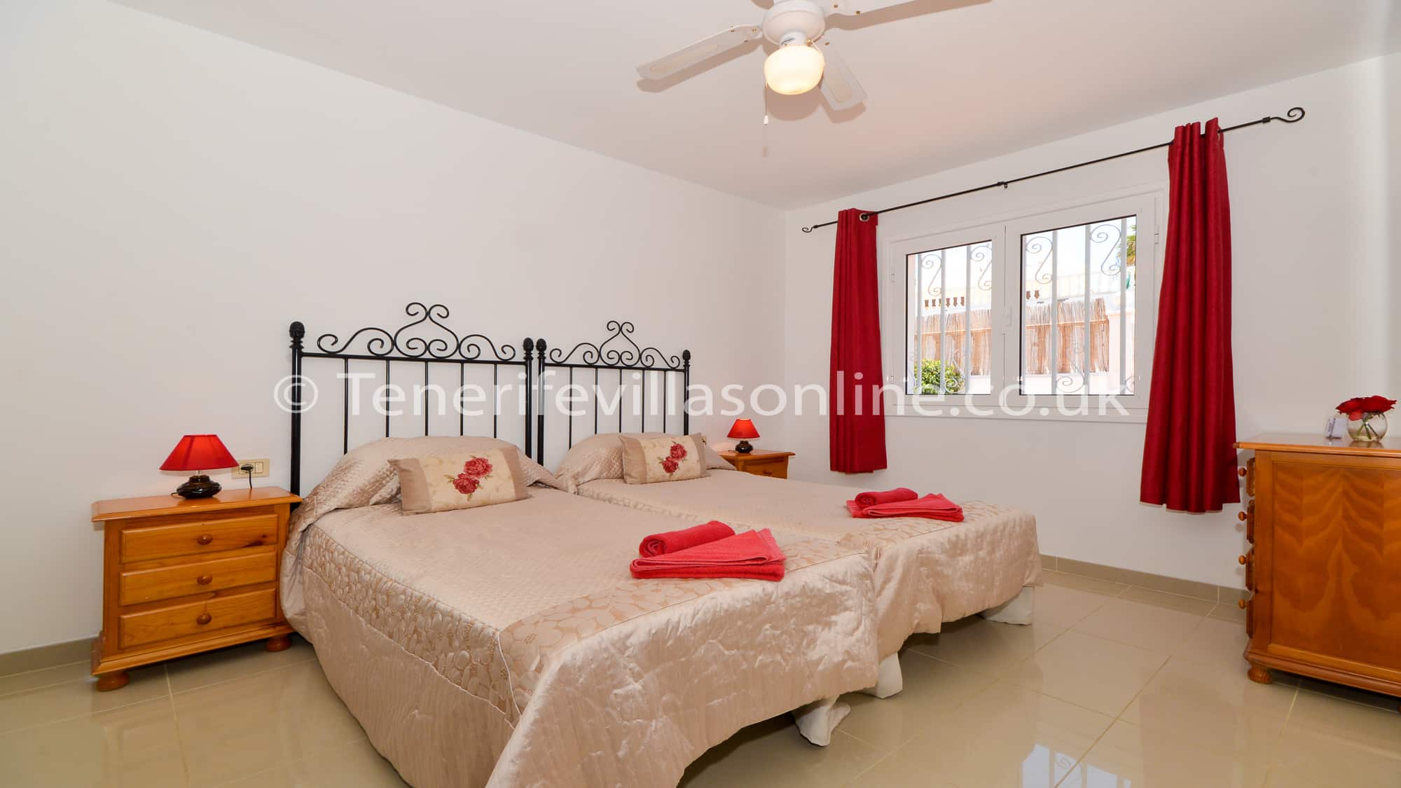Bedroom 1: single beds (x2), fitted wardrobes, ceiling fan, ensuite