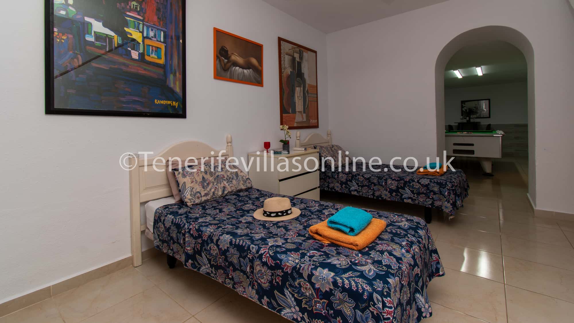 The 1st floor boasts bedrooms 1, 3 and 4 all with en suites and one of the bedrooms includes a balcony with a lovely view overlooking the private terrace. The lower level consists of the remaining bedrooms 5 and 6, a bathroom and the impressive games room. The games room features a pool table and darts for hours of fun and friendly competition. Important note to remember: Bedroom 6 is designed for the 13th and 14th guests, however it’s not a fully private bedroom, the beds are positioned adjacent to the staircase in the hallway on the lower level. Due to high demand from larger groups and many requests, the owner added extra two single beds to accommodate up to 14 guests. This allows for higher capacity but this sleeping arrangement will not be suitable for everyone.
