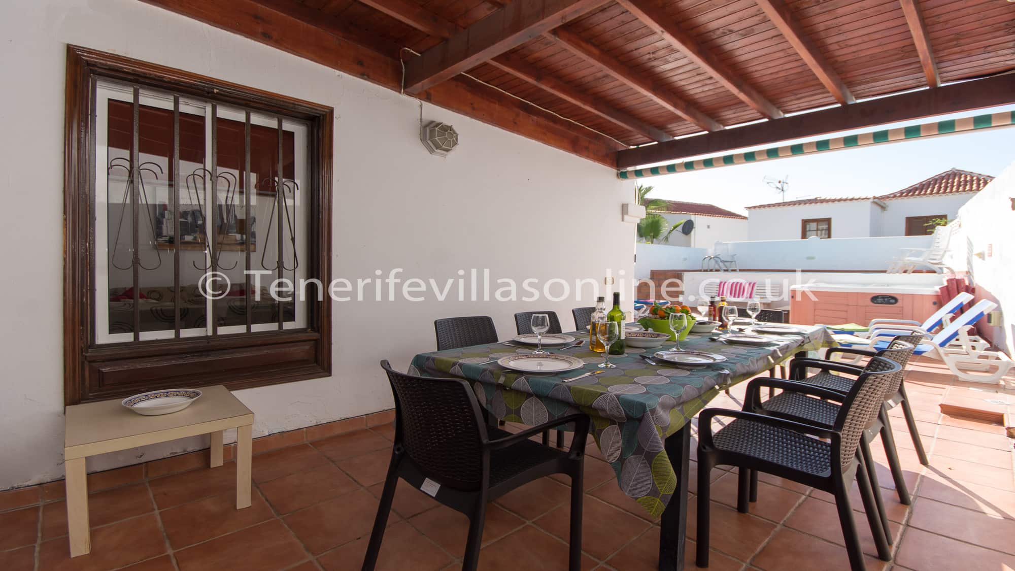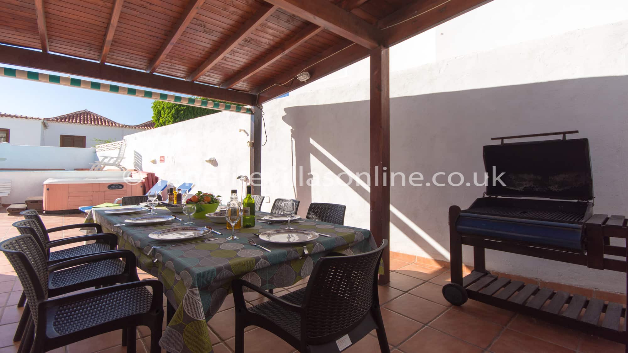 Exterior: hot tub, shaded pergola, dining table, BBQ, adjustable sunshade, recliner chairs, bench, sun loungers