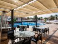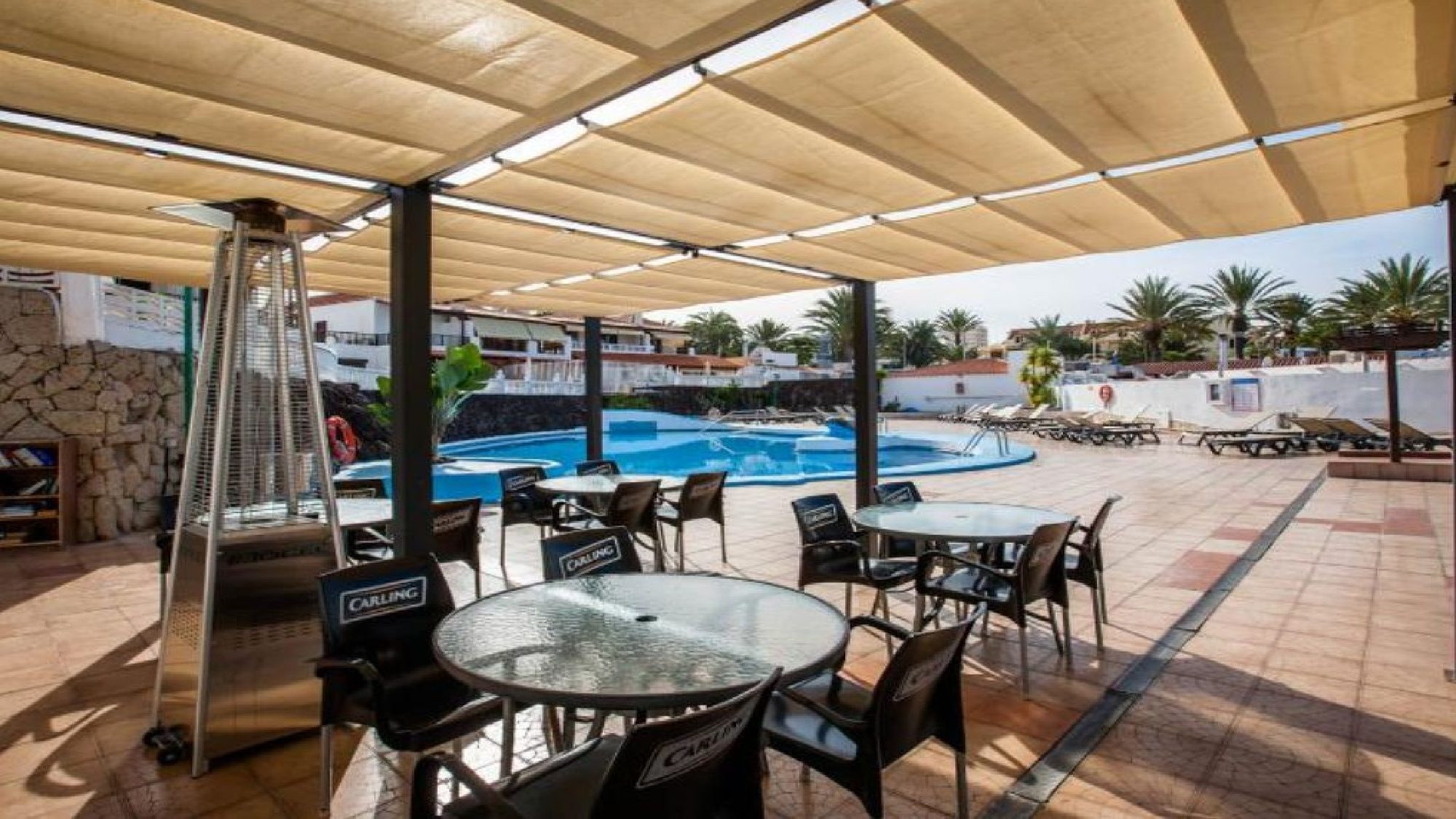 View of communal heated pool terrace with plenty of sun loungers available